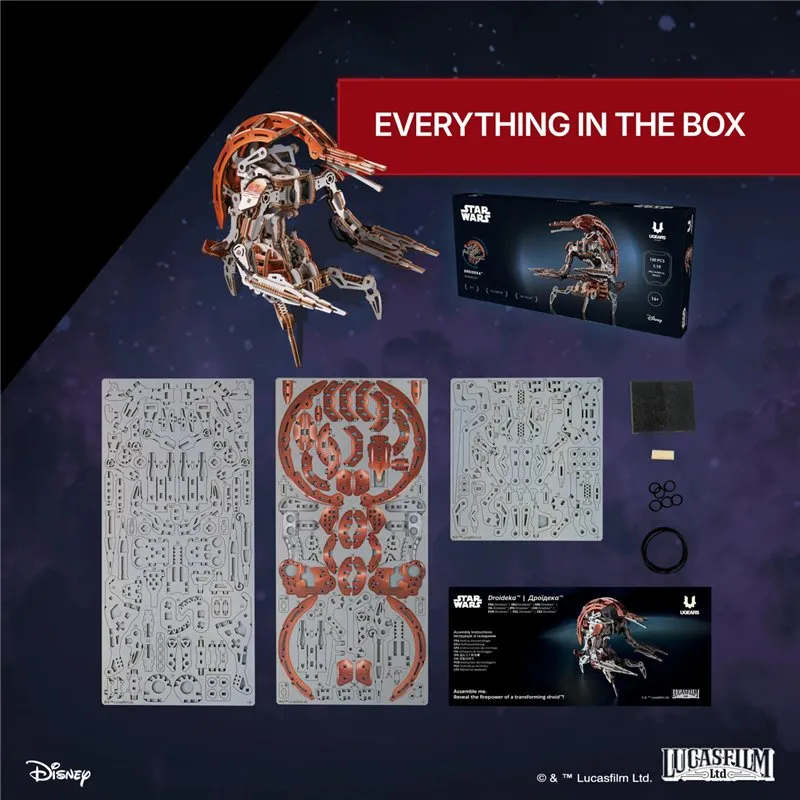 Droideka 3D wooden puzzle by Ugears recreates this iconic transformation with a unique system of rubberized levers. Manually fold the model into a sphere, then release it to spring open into battle stance — just like in the films. The blaster arms can be folded and deployed independently. The model offers two launch modes: just lift it above the table and let it go for reliable activation, or lock the mechanism on one or two notches and roll it to trigger deployment, for a more spectacular and game-like experience.